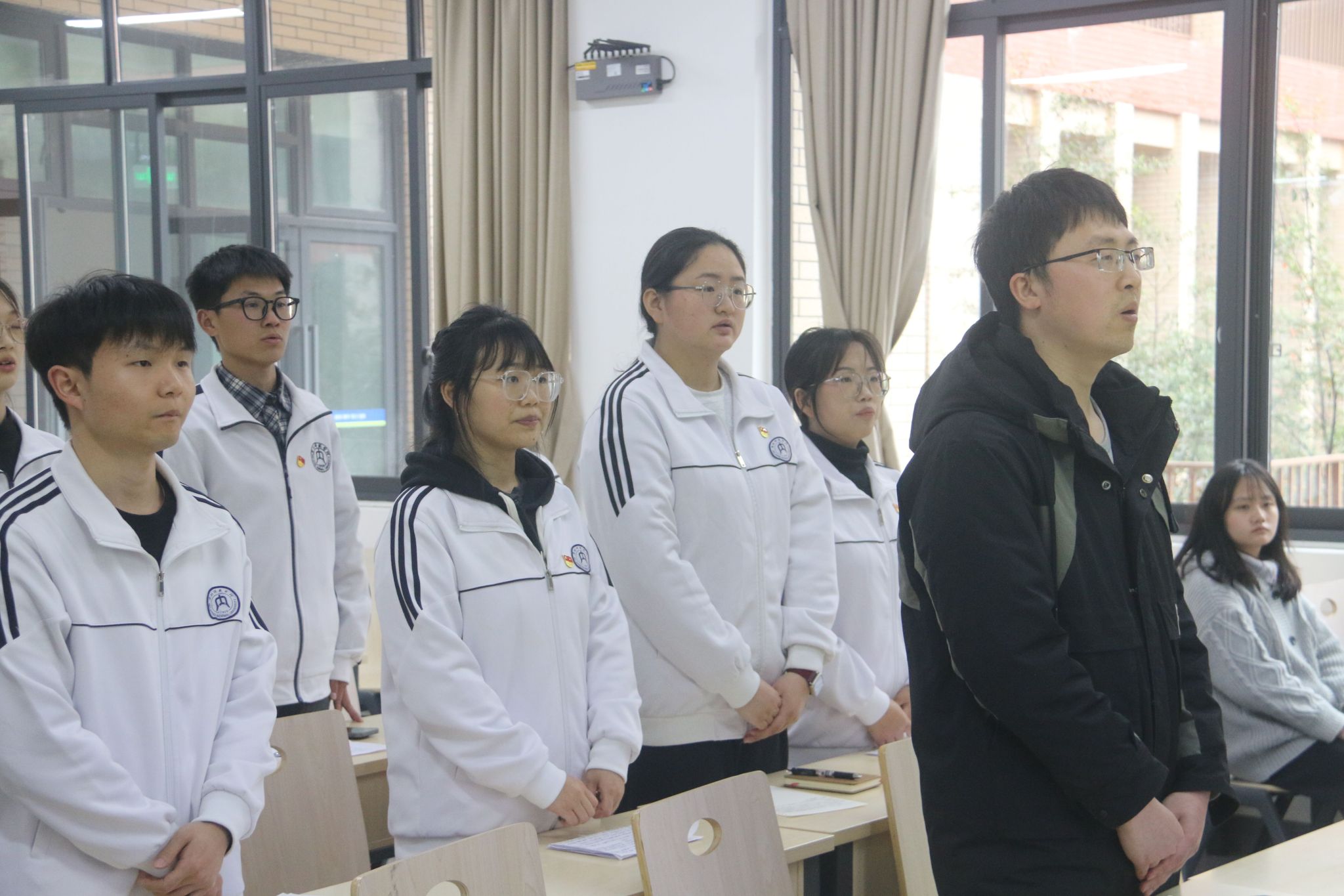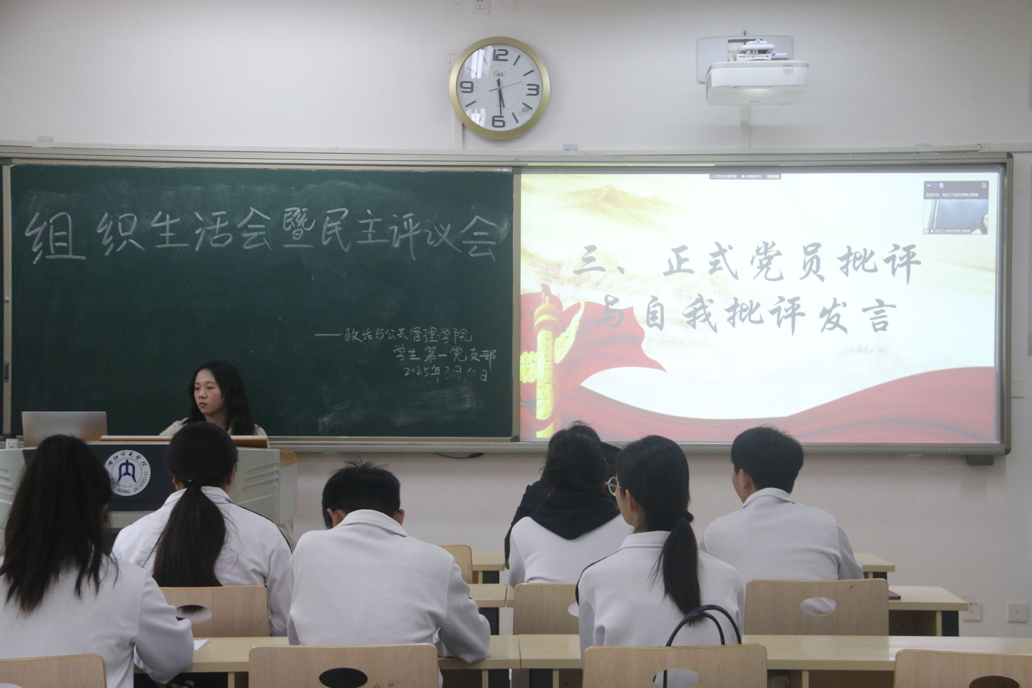 本次会议采用线上线下相结合模式。会议伊始,全体师生齐唱国歌,本次会议在庄严肃穆的氛围中展开。随后,党员依次上台或通过视频模式做批评与自我批评,既对过往进行反思与总结,又对未来做了详细规划,明确了理想目标。在会议总结发言环节,各支部书记对党员们提出要求,希望大家能够以更高的标准严格要求自己,充分发挥党员的先锋模范作用。