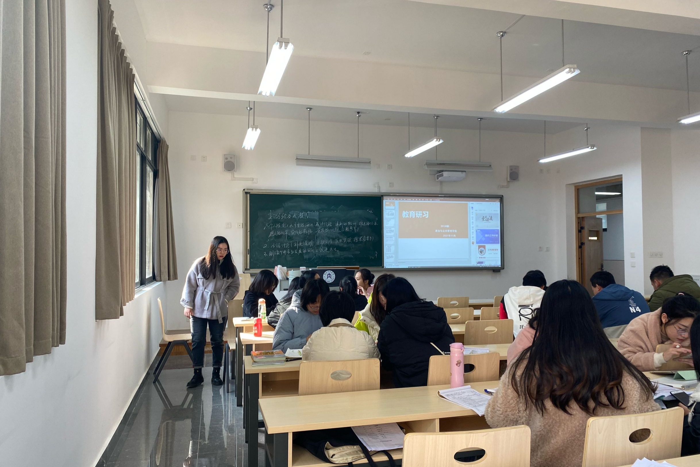 该活动是对公司师范生实习过程的反思和研究,根据历史和思政学科教学新理念、新思想、新方法、新技术和新课程实施要求,通过充分的交流实习经验、教学设计研讨、课堂观察评议、专题班会研讨和教育科研汇报研讨等多个路径,对同学们实习过程中公司产品行为进行分析、探究和评价,以达成经验交流和反思。同学们依次对研习成果进行汇报。首先进行个人陈述,同学们从主要的活动、成功经验的积累、深刻的教训、难忘的经历、感人的细节、实践的感悟、存在的问题与困惑等方面进行陈述;紧接着进行小组讨论,在充分讨论后,成员们对实习过程中的问题进行了反思,对实习成果进行了总结;最后,李荇、叶丹老师在对18级2班同学们的研习情况进行宏观把握后,肖乃慧老师在对18级1班同学们的研习情况进行深入了解,再次引导同学们观察分析不同课堂教学中不一样的效果,并据此进行深入研究,提高同学们的专业知识、专业技能,促进公司师范生专业发展。