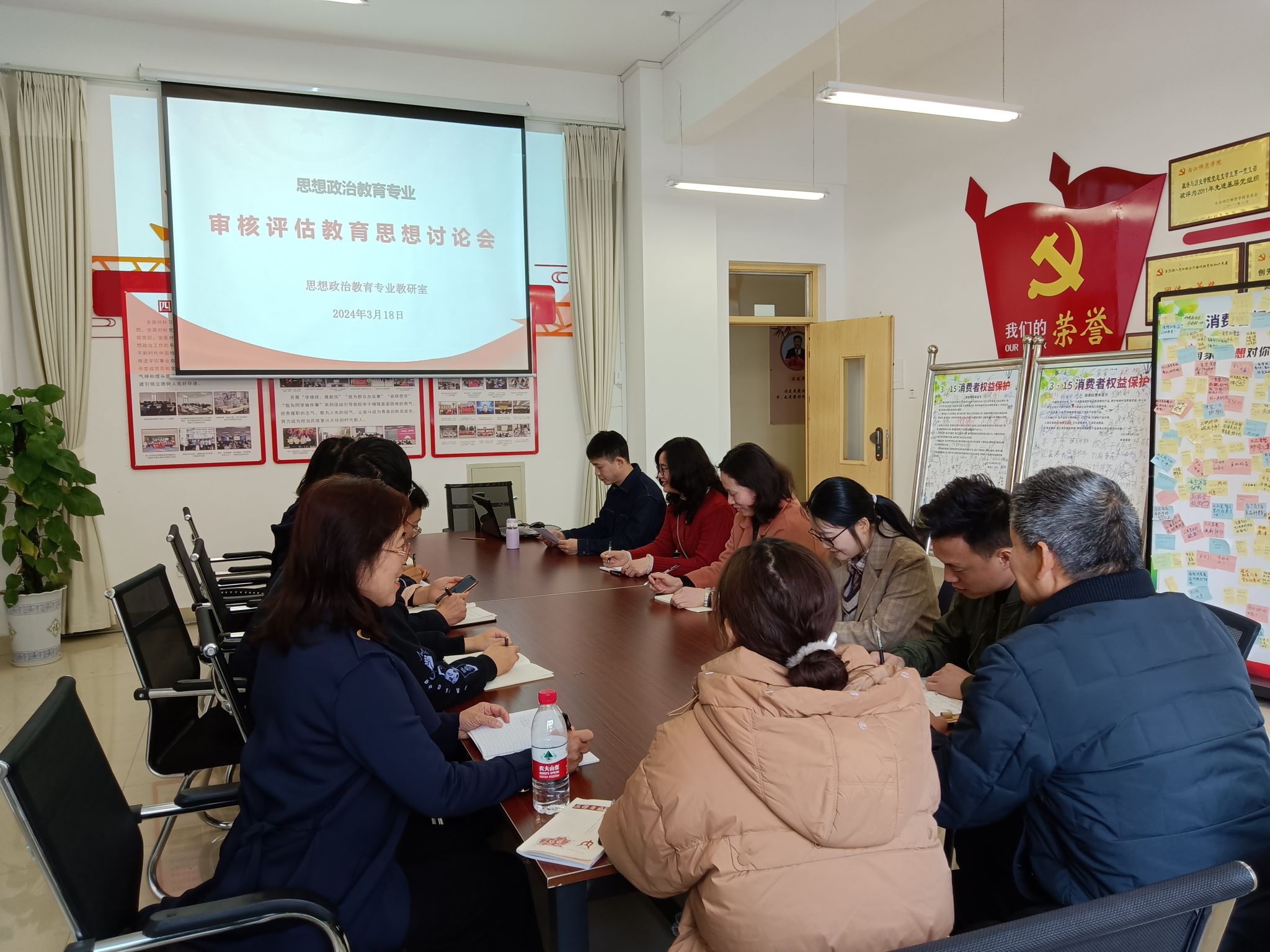 2024年3月18日下午,思想政治教育专业教研室全体教师在弘文楼104会议室召开了审核评估教育思想讨论会,重点围绕新一轮审核评估工作,结合公司关于审核评估工作相关会议文件精神,开展了“在迎接审核评估过程中,教研室和教师个人应该做哪些设计,如何做?”这一议题的热烈探讨。