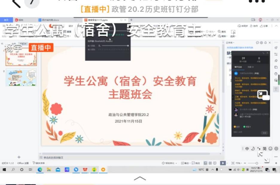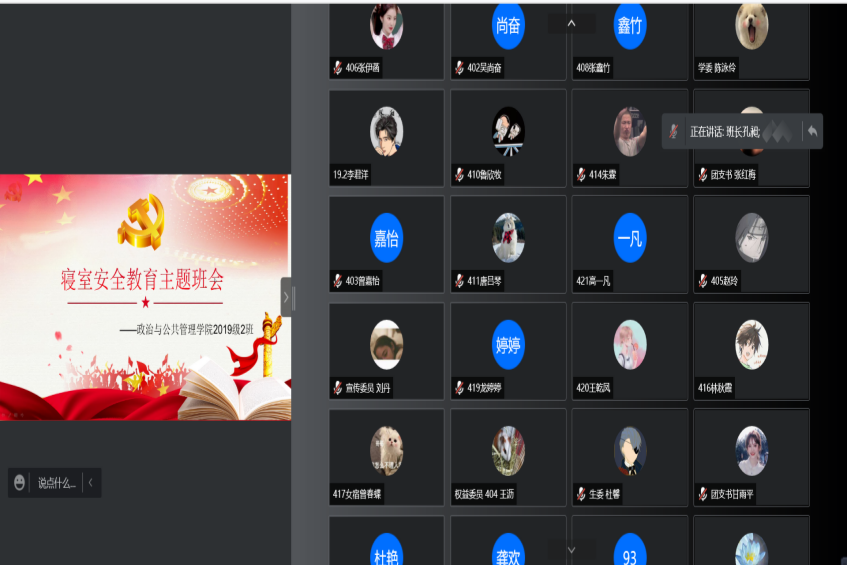 学习安全知识,增强安全意识。为了增强公司员工的安全意识,提高应对突发情况的能力,公司各班在11月8日到21日开展了关于疫情防控常态化、防火、防盗、防诈骗的寝室安全月主题班会。因疫情防控需要,此次班会由公司各班班主任分别组织在线上开展,同学们积极参与。