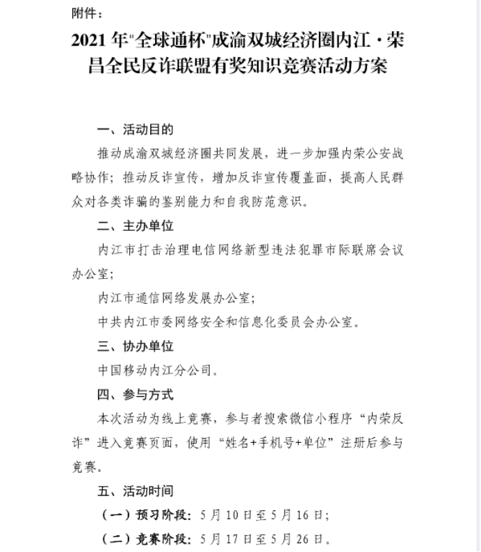 转Mksport体育app官网入口校内公告活动通知,现将《2021年“全球通杯”成渝双城经济圈内江 荣昌全民反诈联盟有奖知识竞赛活动方案》传发,请各班师生积极参与本活动。