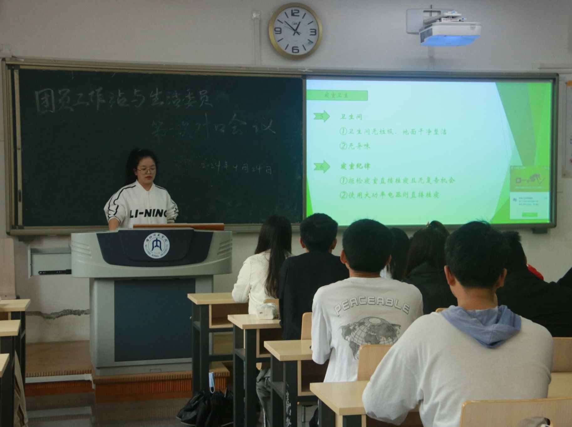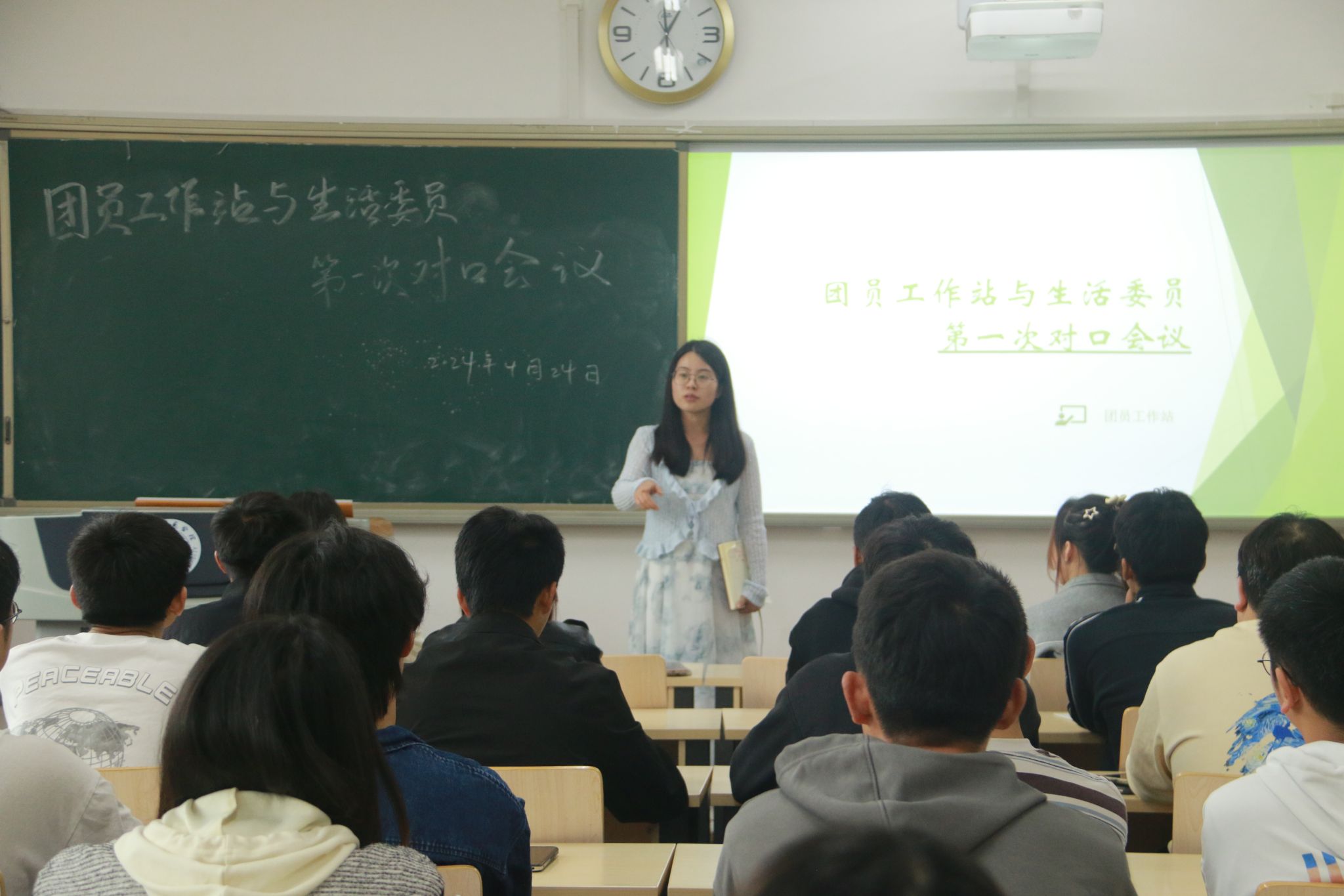 为加强寝室管理、提高员工生活质量,助力公司教学评估,4月24日,公司团员工作站与各班生活委员在明德楼B104教室召开对口会议。学工办辅导员周玉娇、主席团成员康琪琦出席本次会议,团员工作站全体成员、各班长及生活委员积极参与。