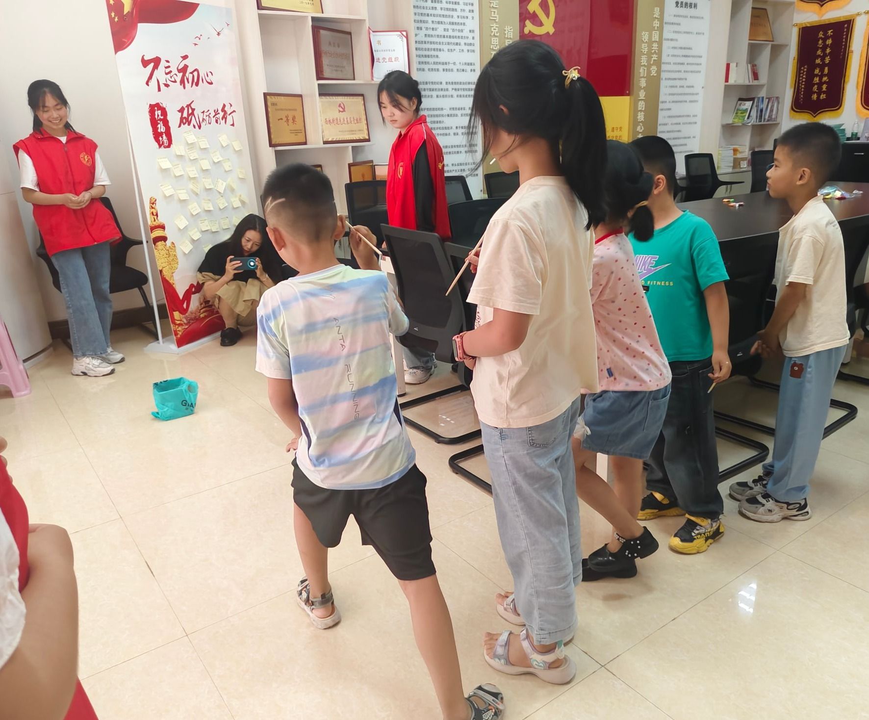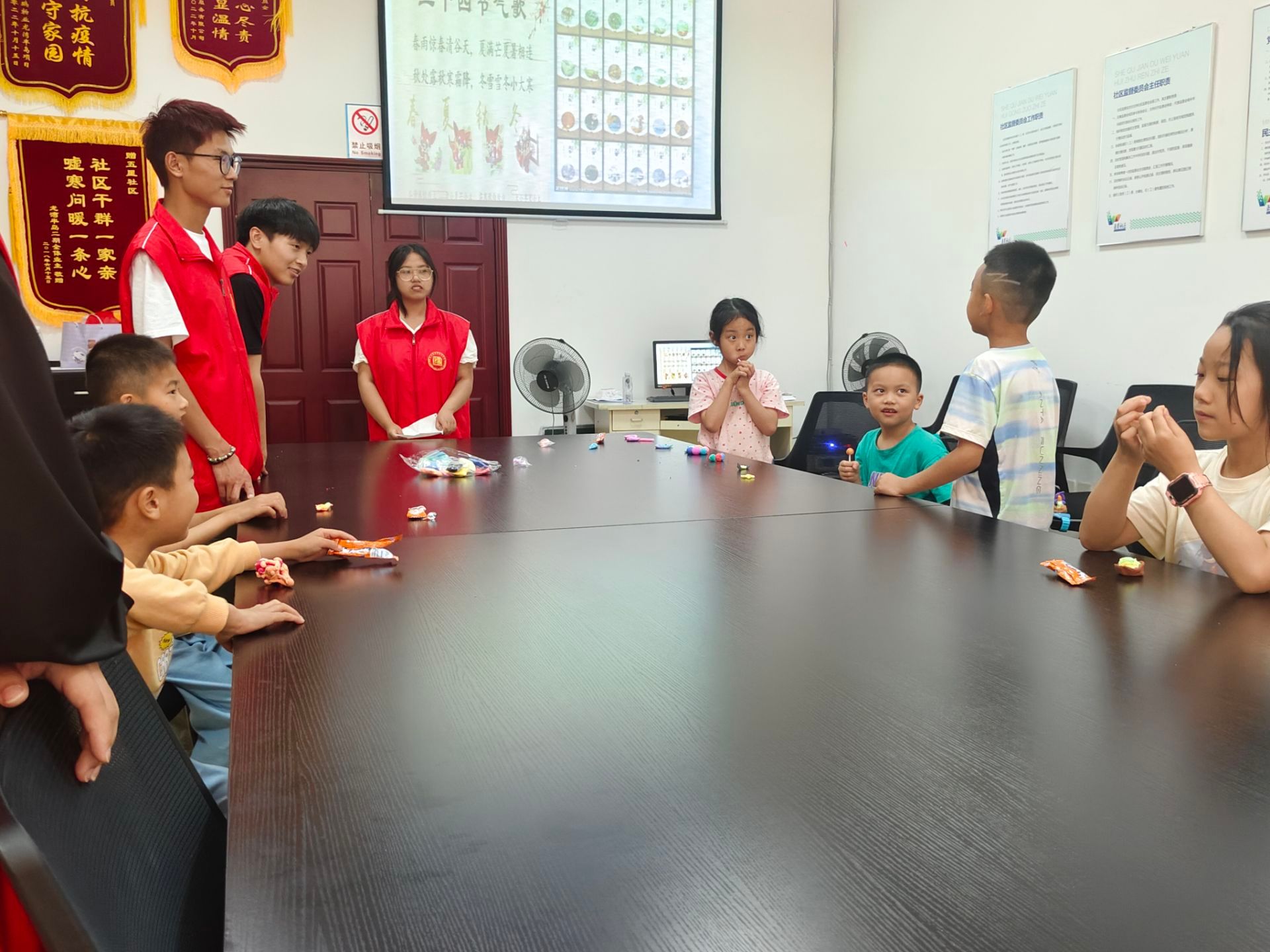 活动伊始,由志愿者协助社区老师维持课堂秩序,调动课堂氛围。课中,社区老师以视频和音频的方式带领小朋友们学会用眼睛去看、耳朵去听,用心去发现美、感受美;并且教会小朋友们要细心地观察生活、感悟生活、感恩生活。随后,借此主题,老师采用“泥塑捏礼物”的形式增加小朋友们对美的感受,鼓励小朋友们制作一个独特的礼物送给家人。与此同时,志愿者们协助小朋友们发挥想象力和创造力,开始“礼物”制作环节。接着,志愿者们以传统二十四节气为切入点,通过播放视频的方式,向小朋友们展现了二十四节气的特征以及相关民俗活动,让小朋友们感受到了中华优秀传统文化的魅力。最后,志愿者们通过开展“辨别蔬果”、“投壶”等小游戏来活跃氛围,锻炼了小朋友们的记忆力与思维能力,现场充满了欢声笑语。