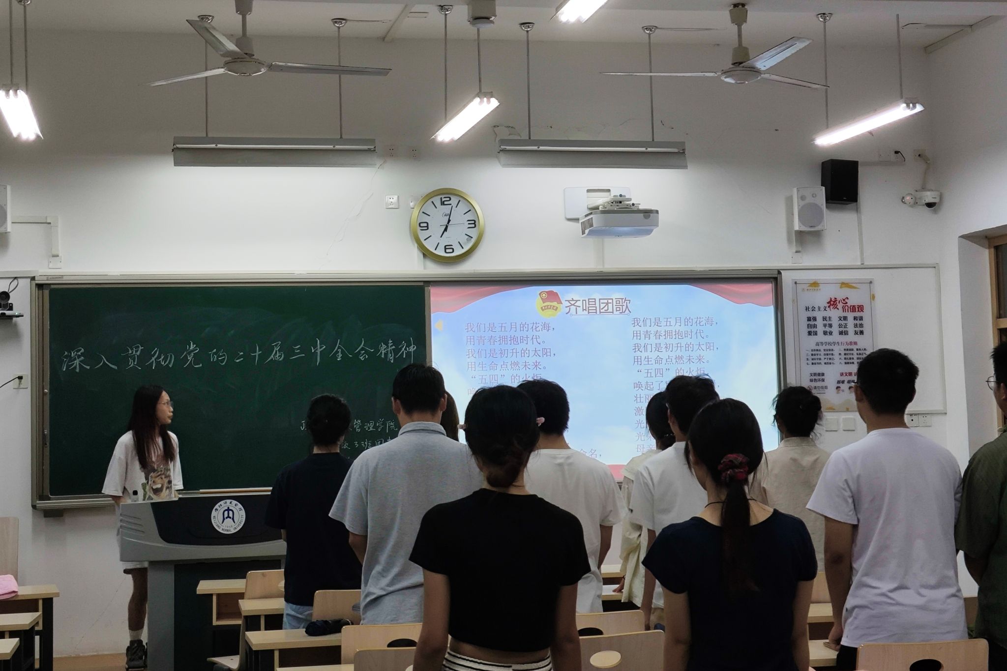 “我们是五月的花海……”每当唱到共青团歌时青年一代便会热血澎湃,团组织生活会也在悠扬的歌声中拉开序幕。各班团支书对本次生活会做具体介绍,带领同学们深入学习贯彻党的二十届三中全会精神,学习文章《紧紧围绕推进中国式现代化进一步全面深化改革——论学习贯彻党的二十届三中全会精神》。紧接着,各班团支书播放视频《中国共产党第二十届中央委员会第三次全体会议公报》进一步深入学习贯彻党的二十届三中全会精神,让同学们明白当前我们国家正处于一个非常重要的时期,面临着前所未有的机遇和挑战。最后,各班团支书再次强调了青年肩负的责任与使命,激励同学们为实现中华民族伟大复兴的中国梦而努力奋斗。