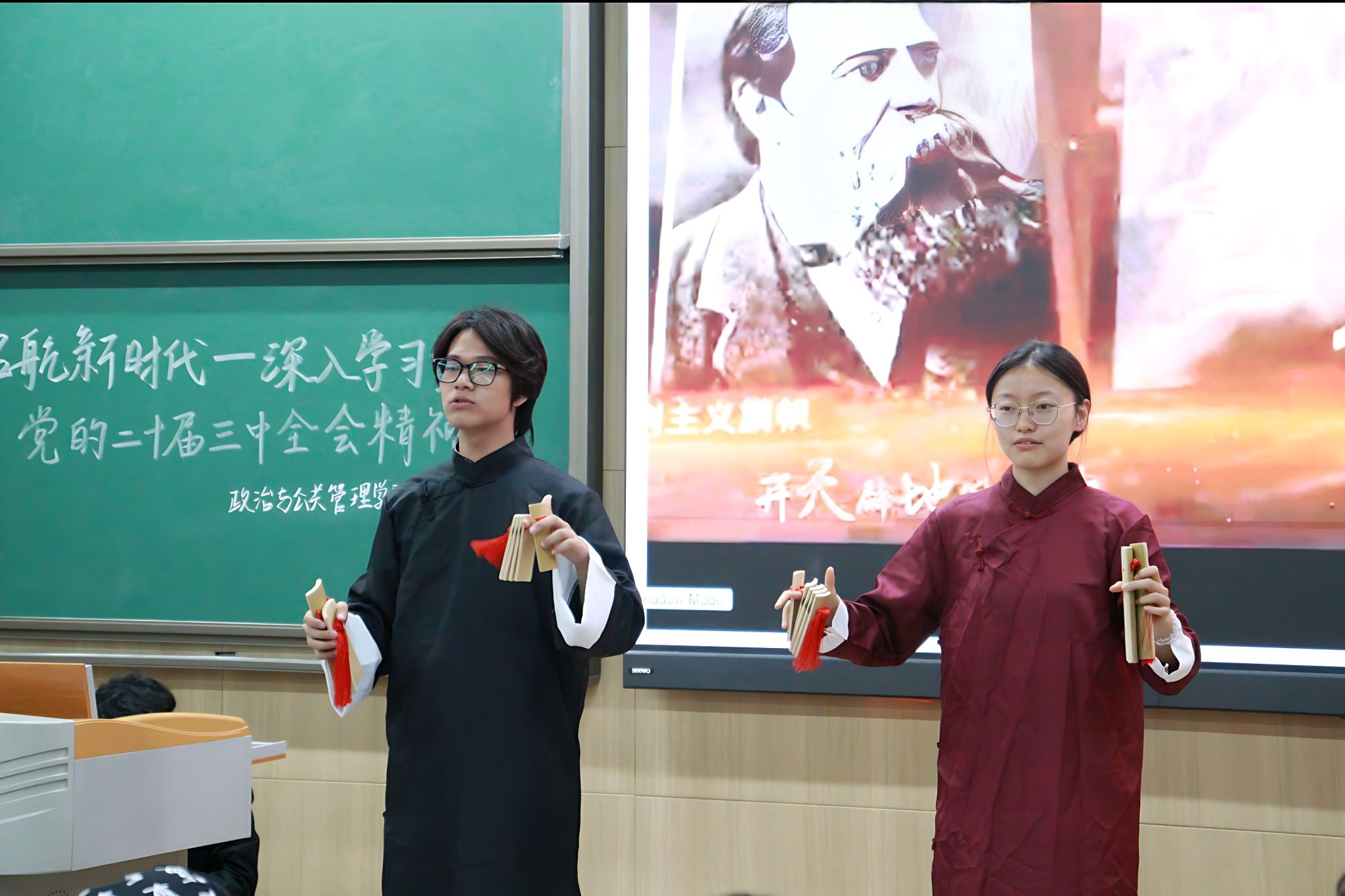 本次团组织生活会在全体成员嘹亮的团歌声中拉开帷幕。随后,快板表演《百年之光》用节奏明快的语言艺术展现了党的百年奋斗历程。活动中,全体成员共同观看了贯彻党的二十届三中全会精神的视频,进一步加深了对会议精神的理解。视频学习后,第一轮知识竞答环节启动,同学们积极抢答,展现了良好的学习成效。紧接着,情景剧《何为青年,青年何为》上演,通过生动的剧情和精彩的表演,引发了大家对青年责任和担当的思考。接着,三位同学朗诵了《恰百年风华正茂》,以诗歌的形式歌颂了党的伟大成就。第二轮知识竞答紧接着展开,同学们的热情不减,积极参与,进一步巩固了学习成果。法律小品《红色土地上的法治守护》以寓教于乐的方式,传递了法治意识和社会责任感。特色节目《我为家乡代言》将活动推向了高潮,同学们用自己的方式表达了对家乡的热爱和对家乡发展的期待,并齐声合唱《我和我的祖国》,表达了对祖国的深厚感情。最后,黄华波上台总结发言,鼓励同学们将所学应用于实践,为实现中华民族伟大复兴的中国梦贡献青春力量。