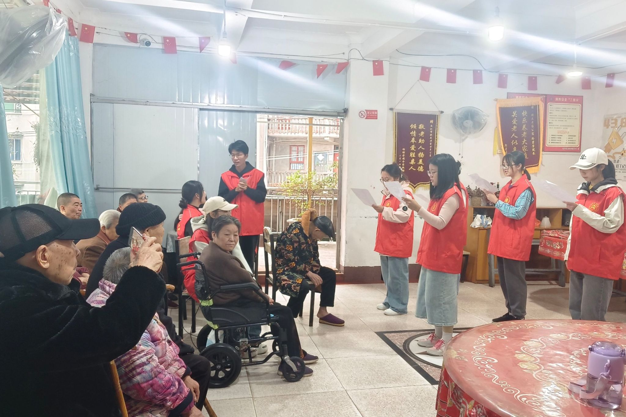 在此次活动中,志愿者们用歌声加手语的方式演绎了手语操《感恩的心》,营造出欢快的活动氛围;还以饱满的热情齐声朗诵诗歌《青春中国》、带动老年人们舞动《清肺拍拍操》、开展《波涛汹涌》和《揪掉小尾巴》等小游戏。通过一系列活动,老人们既锻炼了身体,又在欢乐的氛围中感受到了关爱与温暖。此外,志愿者们与老人们亲切交流,向老人讲解秋冬季节的保暖和养生知识,提醒他们注意饮食和锻炼;倾听他们的故事,感受他们的岁岁年年。本次志愿活动也在老人们的欢声笑语中落下帷幕。