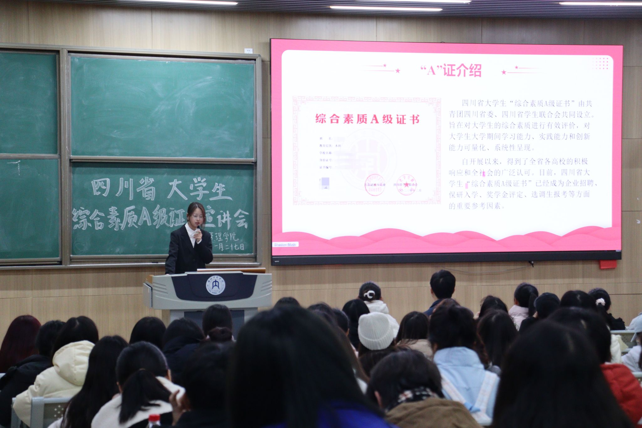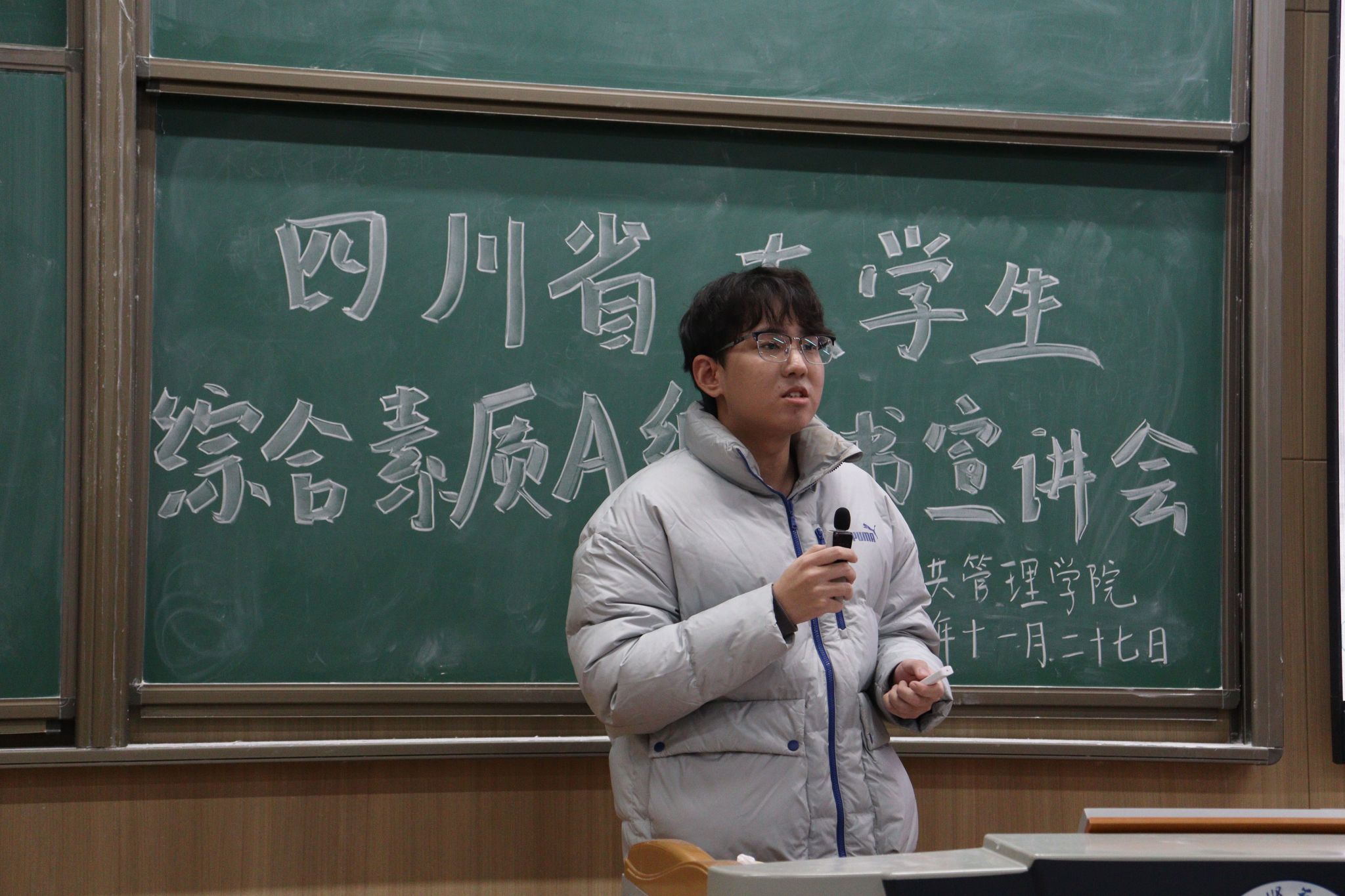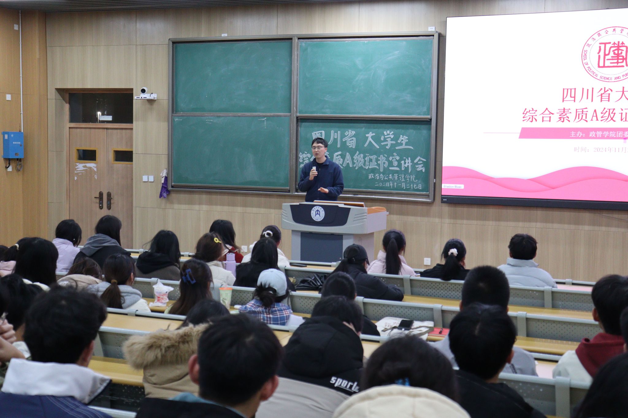 为激励老员工拼搏奋进,促进个人全面发展,提升综合素质,公司于11月27日晚在明德楼B112教室举行了“老员工综合素质A级证书”宣讲会。此次活动由院员工会秘书处成员赵琰主持,学工办辅导员张俊、主席团成员冯春雨和王宁南参加,全体同学积极参与。