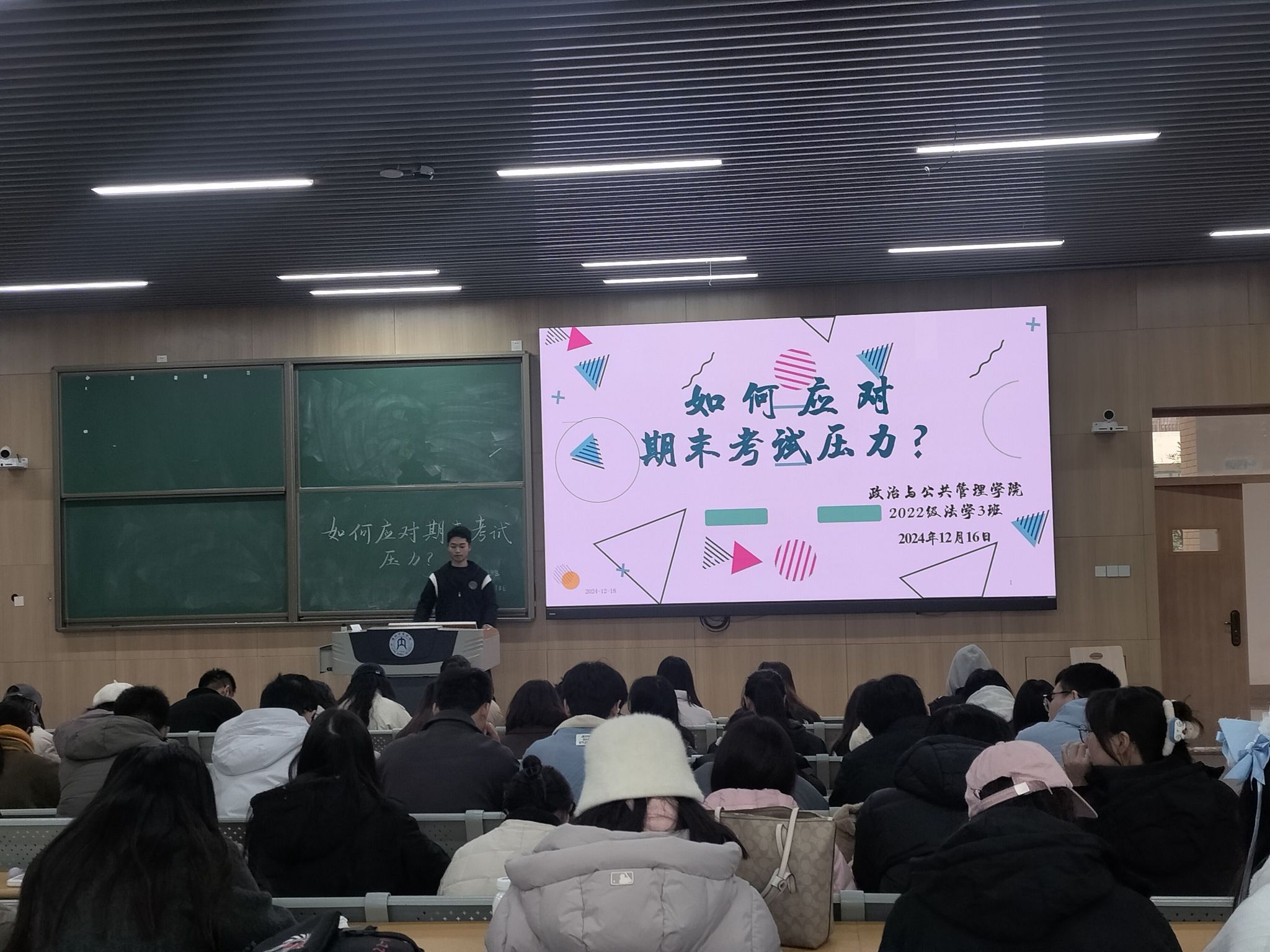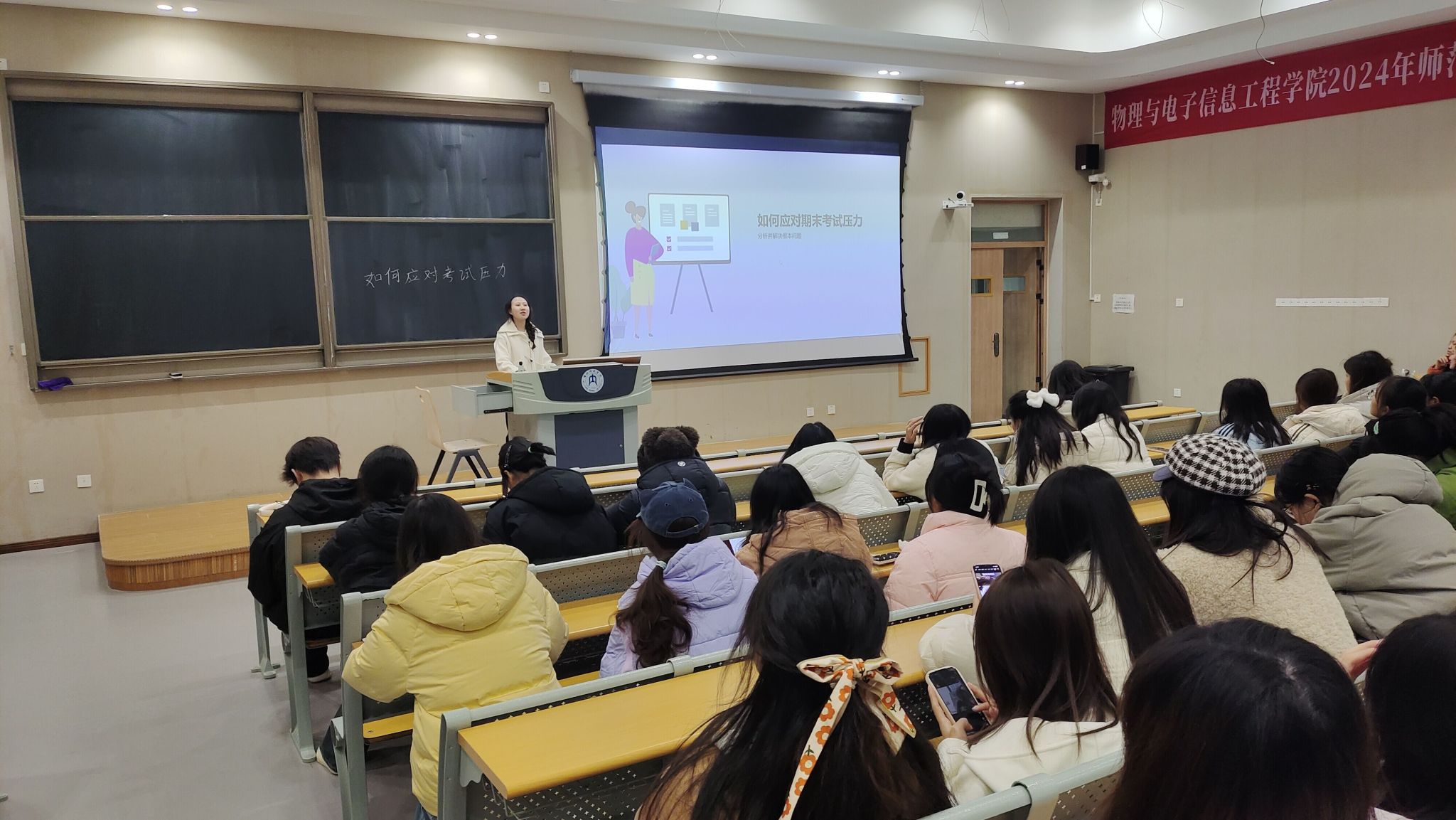 为帮助员工缓解期末考试压力,以良好的心态迎接挑战。12月下旬,我院组织各班在明德楼各教室开展了以“如何应对期末考试压力”为主题的班会活动。本次班会由各班主任主持,全体员工积极参与。
