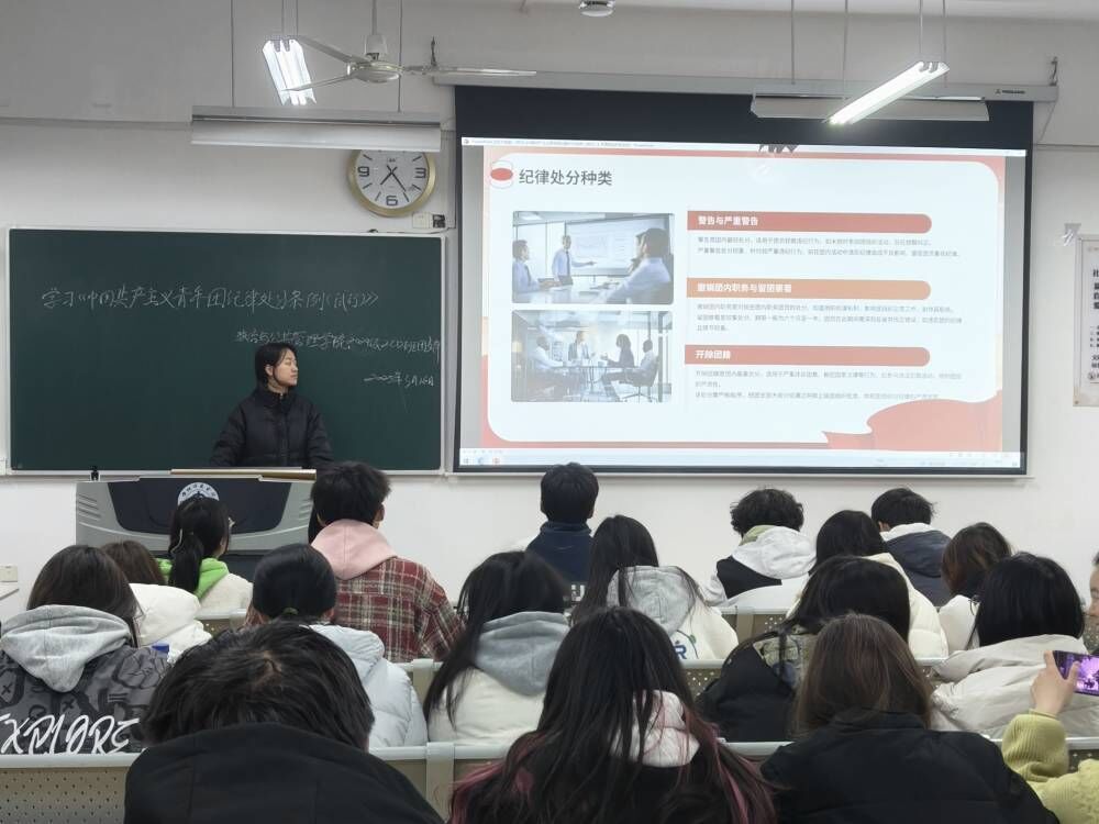 此次团组织生活会在嘹亮的共青团团歌中拉开序幕。各团支书详细介绍了《条例》的主要内容,带领同学们深入学习条例,并结合实际案例进行深入分析。同学们依次发言,分享学习心得,剖析自身在思想、学习和工作中的不足,明确努力方向。同时,班主任对此进行指导,为同学们解疑答惑,帮助同学们进一步理解《条例》的精神内涵,强调自律奋进对促进个人发展的重要性。通过交流研讨,同学们更加深刻认识到新时代青年老员工必须严守团的纪律,坚持锤炼优良作风,积极担当作为,为实现中华民族伟大复兴贡献青春力量。