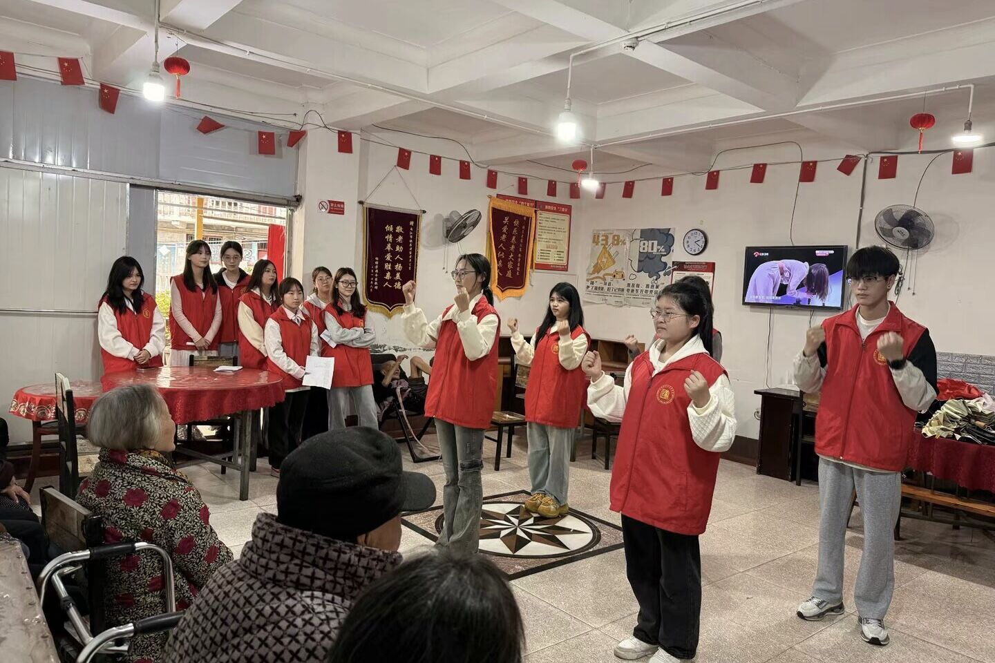 活动在合唱歌曲《童年》中拉开序幕,熟悉的旋律瞬间唤醒了老人们的美好回忆,现场氛围温馨而融洽。紧接着,朗诵《中华少年》激情昂扬,传递出青年蓬勃的朝气与担当;手势舞《红星闪闪》搭配红色故事讲解,更是勾起了老人们的峥嵘岁月记忆。互动环节里,《左手方,右手圆》小游戏趣味十足。老人们与志愿者热情组队,默契配合,在比拼中欢笑声此起彼伏。