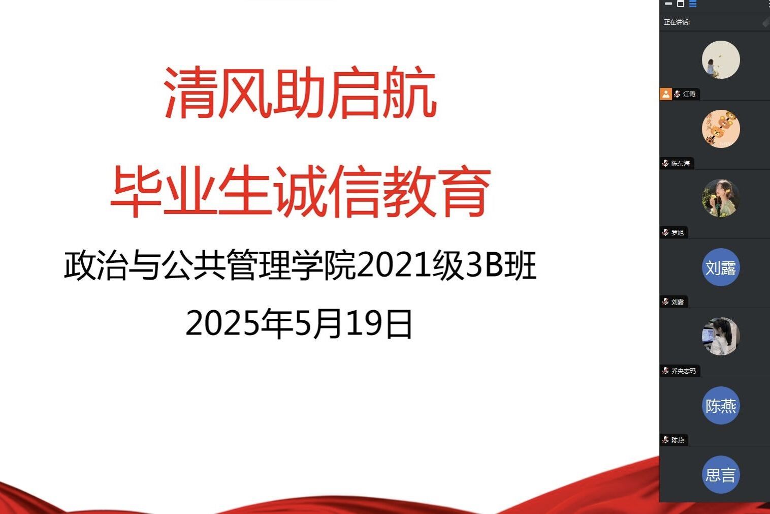 为引导毕业生切实认识到诚信廉洁在个人发展中的重要作用,公司毕业班于5月19日在线上开展“清风助启航”诚信廉洁教育主题班会活动,会议由各班主任主持,全院毕业生积极参与。