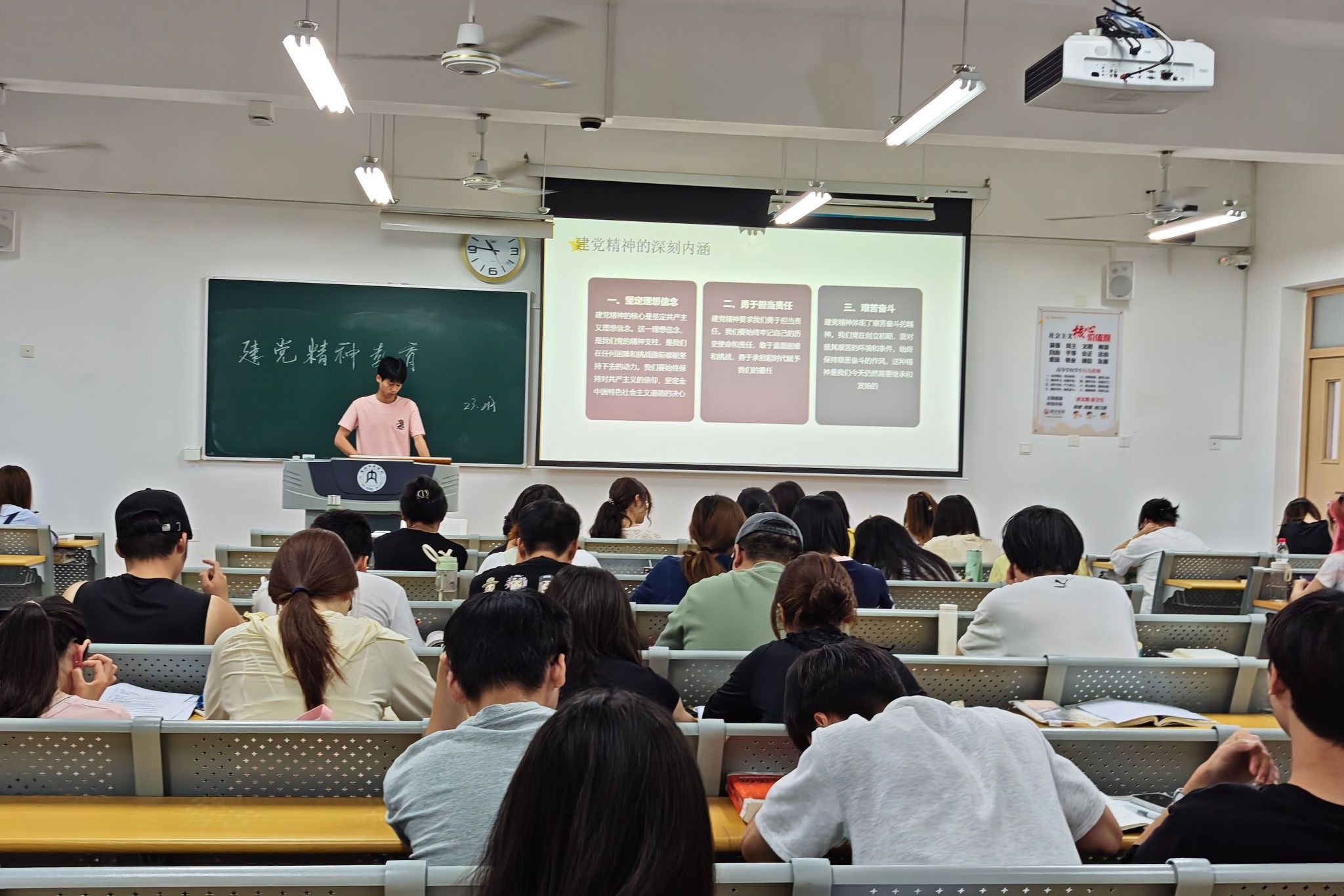 班会伊始,各班主任结合实际案例,讲解了建党精神的基本内涵以及在日常生活中的具体表现。在互动讨论环节,同学们踊跃发言,积极分享自己对建党精神的理解和深刻感悟。在知识问答环节,各班长提出一系列有关建党精神的问题,同学们积极参与、踊跃回答。最后,各班主任对本次班会进行总结,希望同学们强化建党精神、凝聚奋进力量。