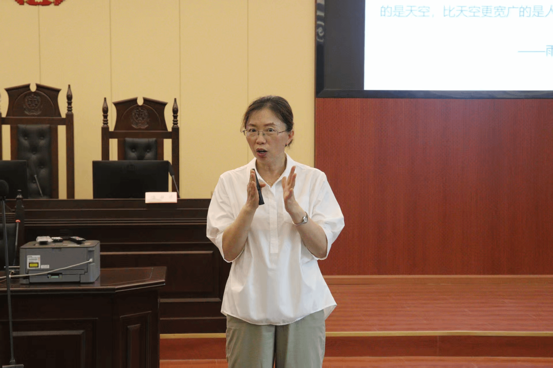 为助力新生筑牢理想信念根基,夯实安全意识与法律思维,公司于9月17日在模拟法庭召开理想信念教育、综合安全与法律宣传主题讲座。本次讲座由公司专职组织员谭化容老师担任主讲,党委副书记候德苹,学工办辅导员张俊、袁妤萱、周玉娇以及2025级全体新生积极参与。