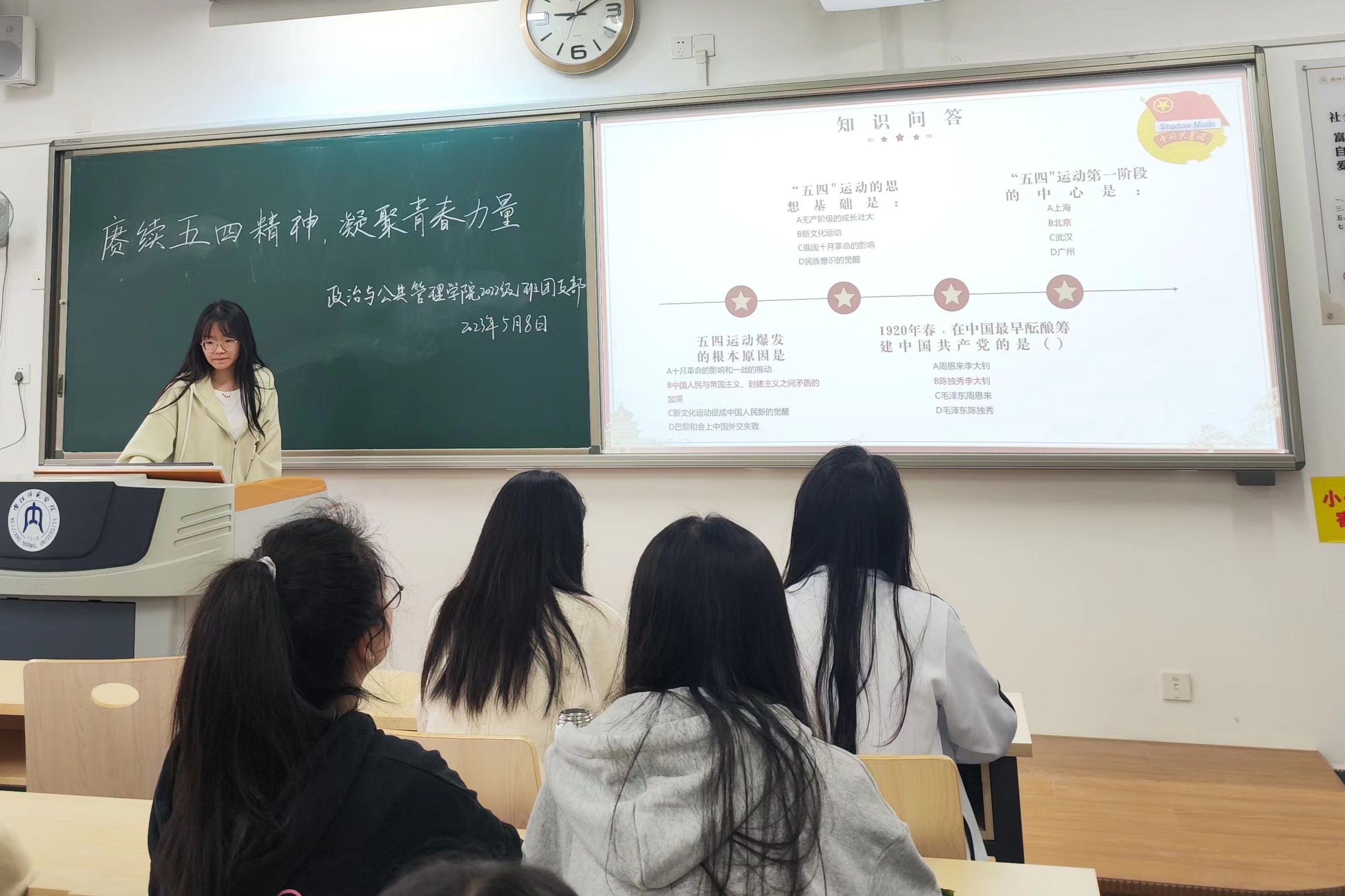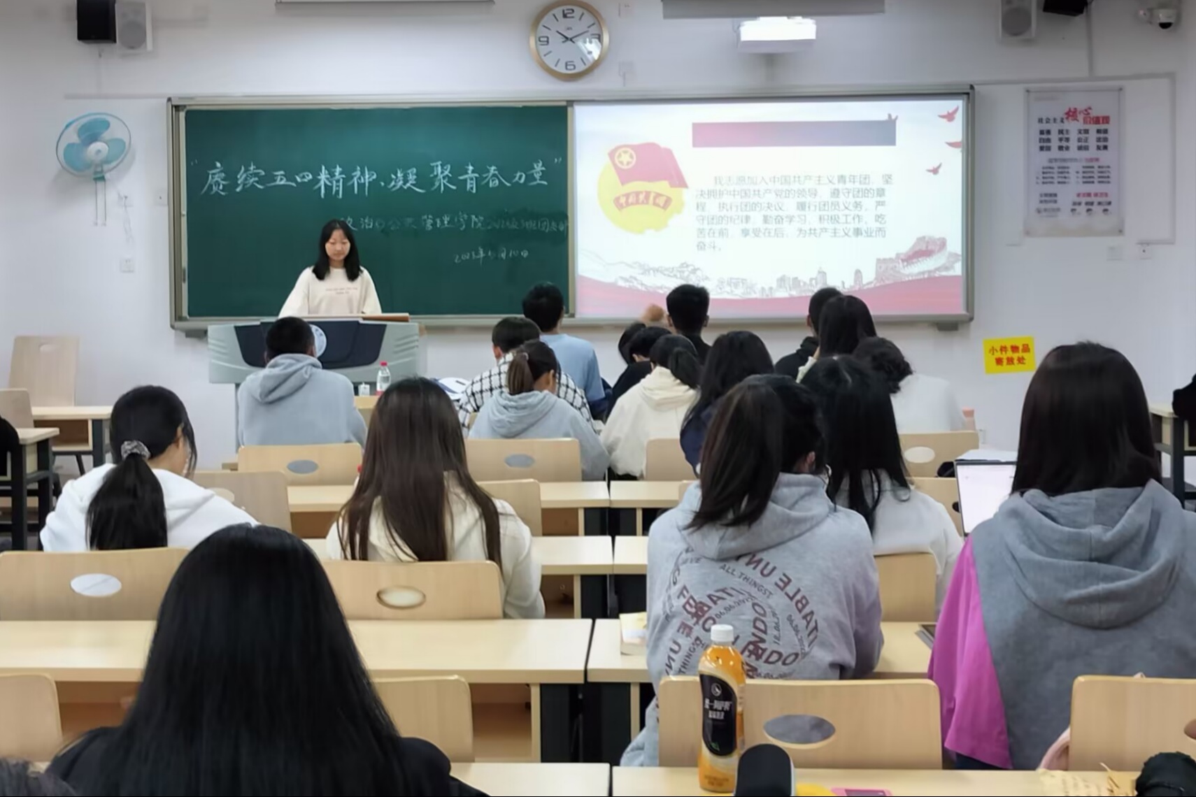 活动伊始,团支书介绍本次团组织生活会的主要内容,组织全体同学齐唱中国共青团之歌《光荣啊,中国共青团》,同学们放声歌唱,感悟身为共青团员的自豪与使命担当。唱歌完毕后,团支书带领同学们一同学习《习近平给中国农业大学科技小院的员工回信》精神和《总书记心中的新时代好青年》,并请同学分享心得,他们纷纷表示会在奋斗中释放青春激情、追逐青春理想,努力争做新时代好青年。随后,全体成员共同观看视频《破晓》《不负青春!你的样子,就是中国的样子》《青春如炬》,加强了对党的青年运动历程的学习和领悟。紧接着,各班开展了知识竞赛,让同学们在答题中加深对五四精神的理解与认识。最后,同学们积极地分享了自己的感悟,表示会进一步继承和发扬五四精神,努力将个人理想、个人奋斗与国家紧密相连,紧扣时代脉搏,为党和国家做出自己的贡献。