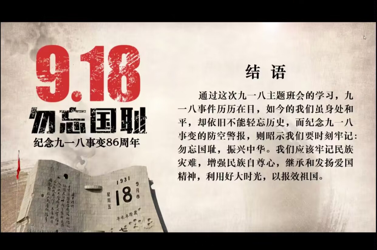 为学习贯彻习近平总书记来川视察重要指示精神,全面落实党中央决策部署和省第十二次党代会精神,统筹做好新学年公司产品开局工作,营造喜迎党的二十大浓厚氛围。同时也是为了纪念九一八事变爆发第91周年,悼念在侵华战争中逝去的同胞们,鼓舞同学们继承先烈,牢记使命,为中华民族的伟大复兴贡献出自己的一份力量。公司各班于9月18日在线上组织开展秋季学期“开学第一课”。