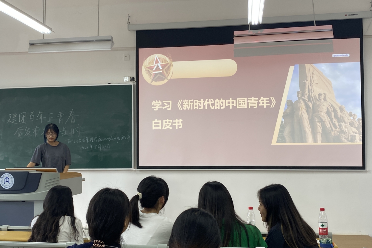 团课伊始,由主持人组织与会员工共同歌唱中国共青团之歌,同学们放声歌唱,感悟新青年所应该肩负的历史责任与担当。通过重温入团誓词环节,同学们再次感受到五四精神的薪火相传,有助于进一步加强青年精神素养提升工作,为同学们树立正确的理想信仰。之后,全体同学共同欣赏建团百年主题MV《有我》,感受新时代下团的生机与活力。随后,同学们还积极学习了《新时代的中国青年》白皮书、《新时代加强和改进共青团思想政治引领工作实施纲要》,并观看了其他有关团史的相关视频,同学们在轻松愉快的氛围下更加清楚地了解了团史。