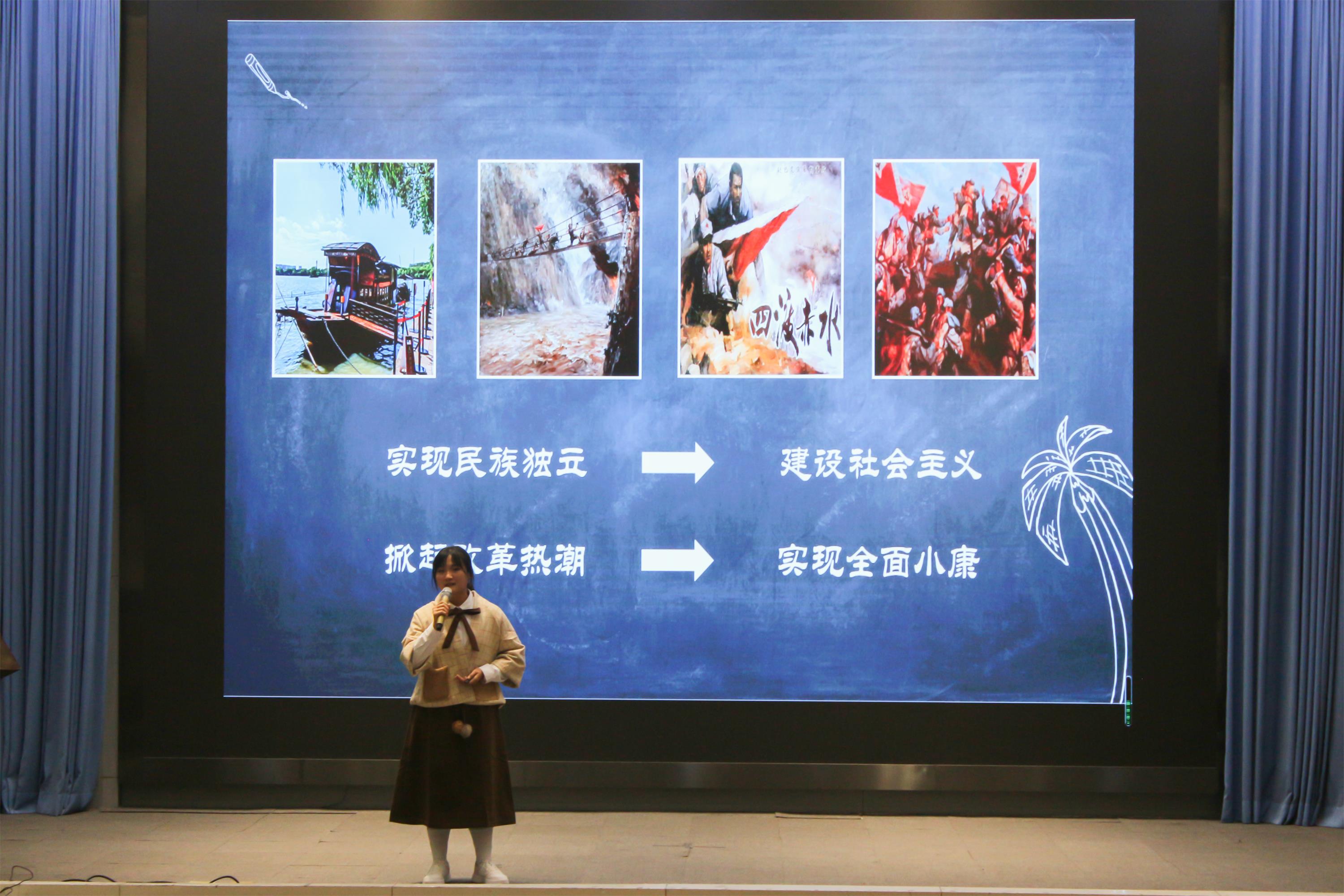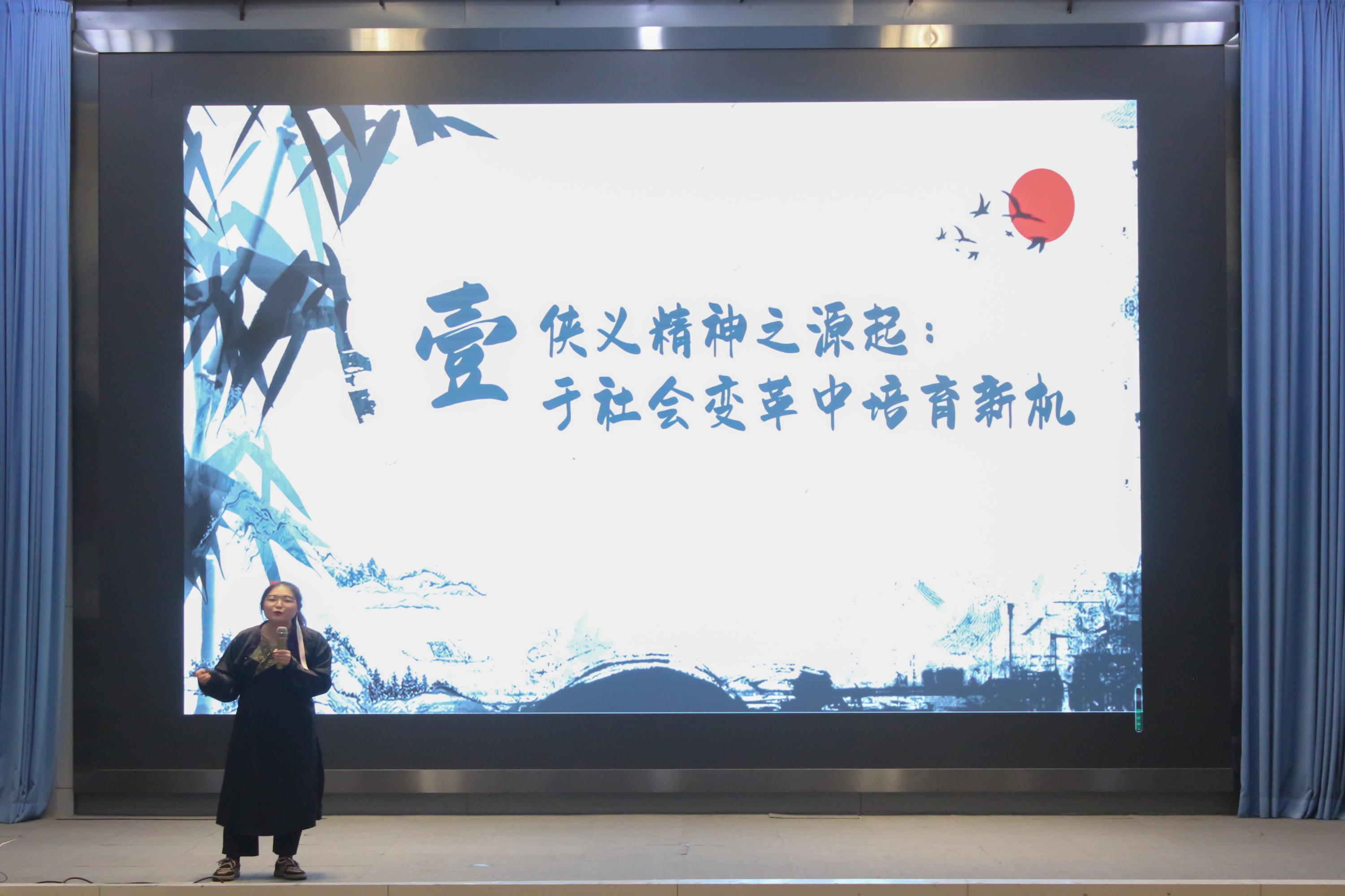 首先上场的是陈美玲同学,她的演讲题目是《侠之大者,为国为民》。探讨中国传统的侠义精神,将民族精神与现代实践相结合,她的演讲将其广阔的视野和辩证思维的深度展现的淋漓尽致,引发了听众关于侠义精神的思考,促进了侠义精神在现代实践中开花结果。随后刘定雨同学的《觉醒年代》从文化自信的角度回望中国百年峥嵘岁月,沿袭前辈深沉思索,她的演讲探究了红色影视作品对还原历史、提升文化自信的作用,也展现出了她对党史的深刻理解和对文化自信发展道路的深刻把握。公司最后登场的杨宇同学的《我若不勇敢,谁替我坚强》,则是以个人经历和杰出人才为例,描述了中国人民不畏风雨、不畏艰险的民族精神,将个人与国家结合起来,展现出了青年一代建设祖国的坚定信念。