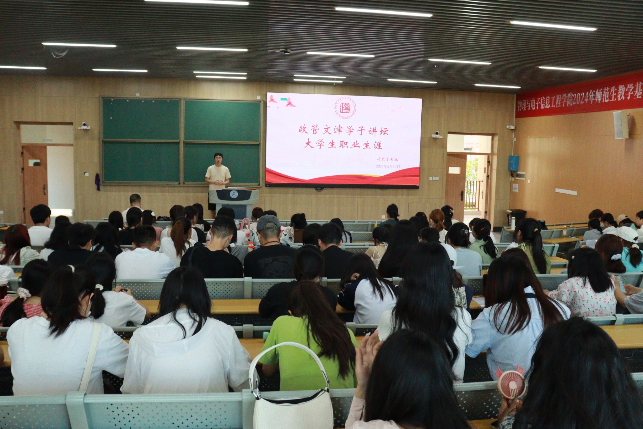 宣讲过程中,首先由刘寿师兄就考编上岸故事、顶岗支教经历、坚定自身信念、锻炼自身应变能力和抗压心态等几方面内容与同学们分享经验,让同学们对考编有了一个全新的认识。其次,王秋霞师姐提出要敢于尝试,不断提高自身讲课能力和表达能力。之后,杨玲师姐向同学们分享了她的建议,提醒同学们在大学期间要多参与部门和社团等课外活动,锻炼自身能力。随后,曾兰楠师姐分享了关于秋招、校招及其他公司招聘就业的经验,包括提前打听面试要求、准备拿手课和材料、完善简历等。最后,沙古歪师姐强调了要结合考编地区进行前期准备工作,分享了获取就业信息的平台与公众号,并寄语同学们要珍惜每一次上台机会去锻炼自己,保持稳定的心态。最后,张俊进行总结,希望同学们要具备良好的抗压能力,不断挑战自我,抓住机遇;同时也告诫同学们对未来的规划切不可好高骛远、脱离实际,要将自身实际情况与目标相结合。