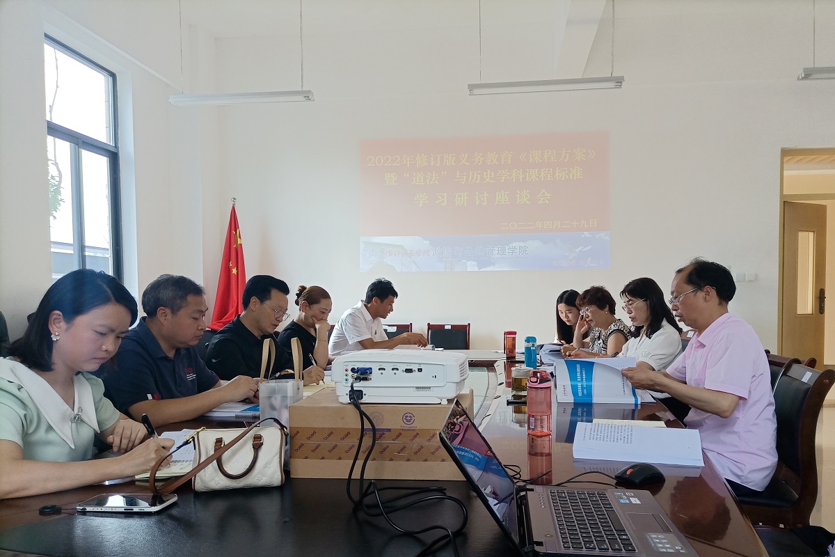 为加强思想政治教育和历史学两个师范专业面向中学思政和历史学科教师培养的针对性,政治与公共管理公司师范技能教研室特地于2022年429日下午在弘文楼104会议室组织召开专题座谈会,围绕义务教育阶段最新版《课程方案》和道德与法治、历史两个学科的“课程标准”进行了集体学习和研讨。内江市教育科学研究所副所长兼中学思政课教研员、公司思政教育专业客座教授古文杰,内江市教育科学研究所中学历史教研员、公司历史学专业客座教授代焰明,内江市六中上南校区初中道德与法治课教师孙洁,内江市六中高新校区中学思政课教师卢天杰、历史课教师吴忠琼等五位来自基础教育一线的专家和教师应邀参加了座谈研讨。会议由公司副经理庞超主持。