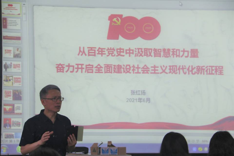 课堂伊始,张红扬教授先是与同学们交流思想政治专业考研的一些小技巧,同学们瞬间被吸引,课堂变得十分活跃。接下来步入正题,张红扬教授进行党课教育,主要从讲述‘从百年党史中汲取智慧和力量,奋力开启全面建设社会主义现代化新征程’这一理念中来阐述党史教育的重要性。而后,张红扬教授分享了中国从建国至今领导人对加强党史教育所做出的努力,从上至下全面开展党史学习不忘教育。最后,张红扬教授针对‘深刻把握开展党史学习教育的重点和目标’这一问题,着重对同学们进行讲解,引导同学们深入学习百年党史,树立正确世界观、人生观、价值观,加强同学们全面推进社会主义现代化建设的决心,鼓励同学们为实现中华民族伟大复兴中国梦贡献自己的力量。