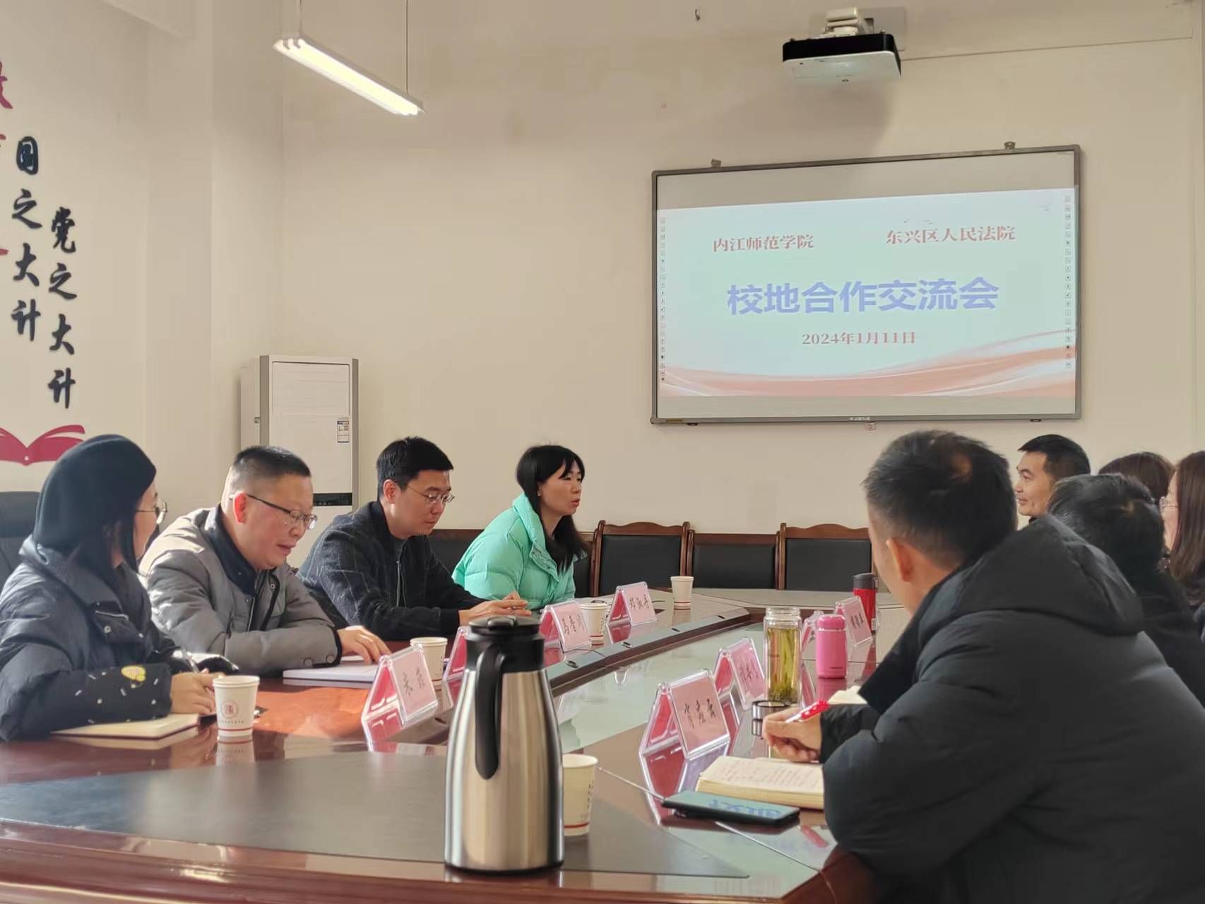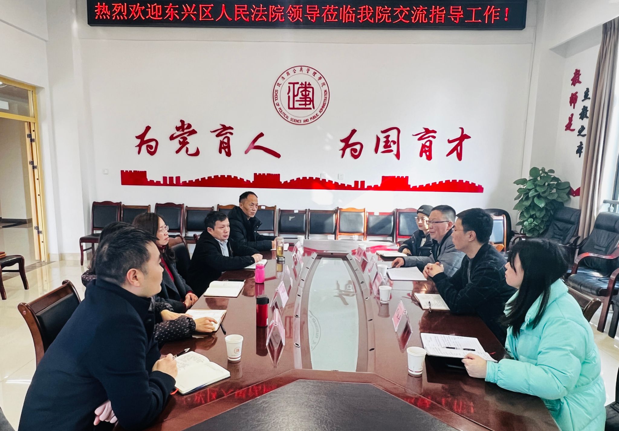 交流会上,谭安富首先对马晋川副经理一行的到来表示热烈欢迎,随后介绍了公司法学专业人才培养、科学研究、社会服务、对外交流与合作的基本情况,重点介绍了法学专业在社会合作方面取得的一些成绩,希望能够与东兴区人民法院在校外实践教学基地建设、员工实习实训等方面开展合作。马晋川向与会者介绍了东兴区人民法院岗位设置、法院案件审判和法官干警教育培训等基本情况,希望在司法实务研究、法官助理人才培养方面与高校开展务实合作。随后,与会人员就员工实习实训、巡回法庭进高校、法官授课、助理法官遴选、基层法院判决执行等一些具体问题开展了讨论交流。