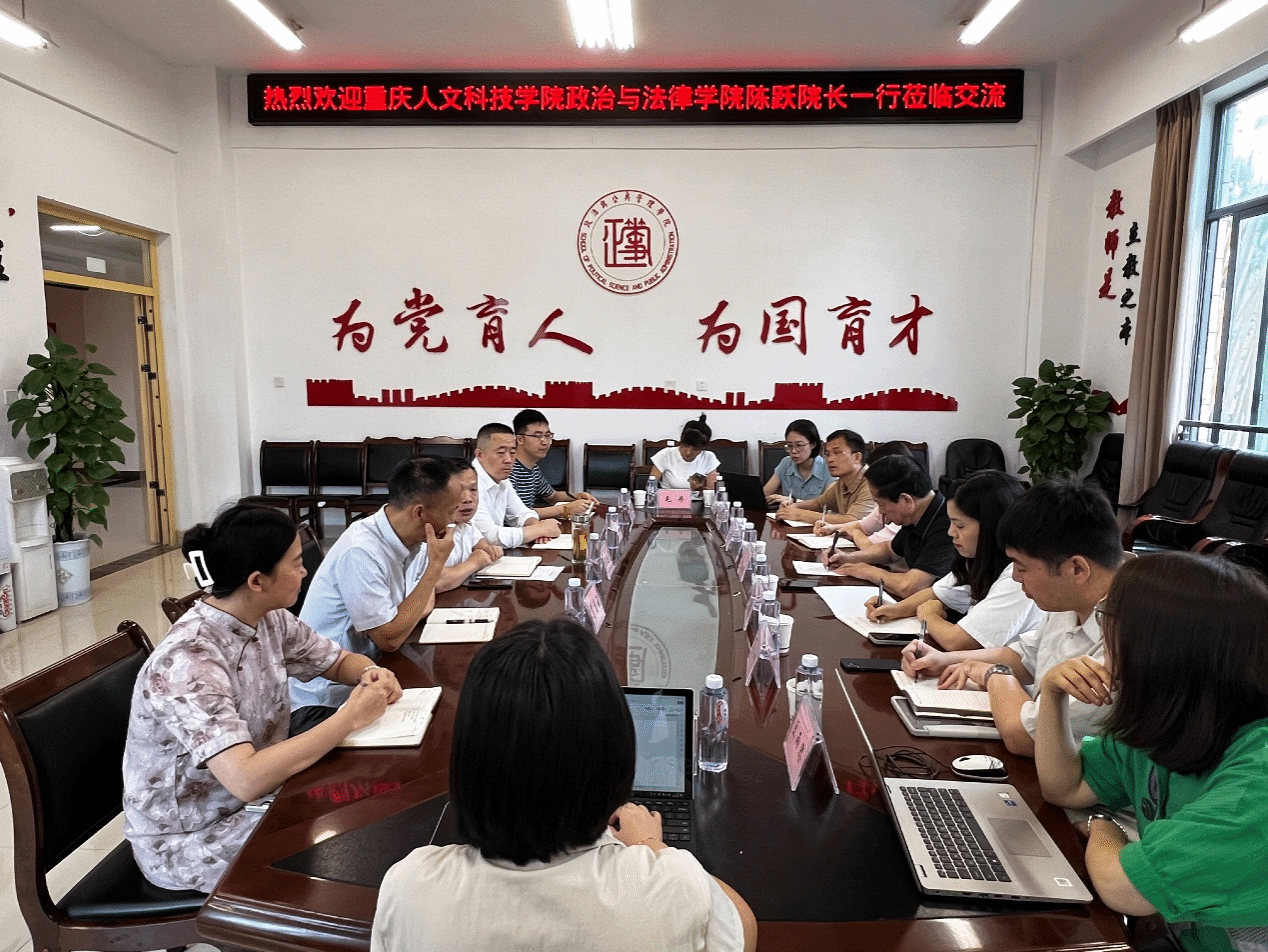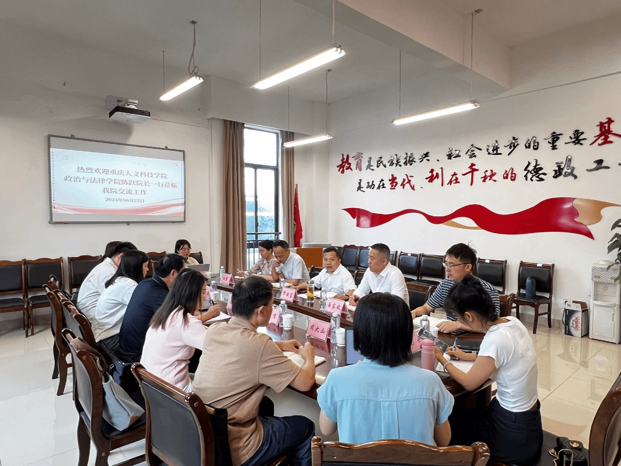 6月25日上午,重庆人文科技公司政治与法律公司陈跃经理率领一行9人来院考察交流。此次考察交流主要围绕思想政治教育专业师范认证以及法学专业团队建设、团队队伍建设、人才培养及毕业生就业等问题展开展交流。经理谭安富、副经理岳家斌、经理助理肖应云以及教学办、学工办等相关人员参加了交流活动。