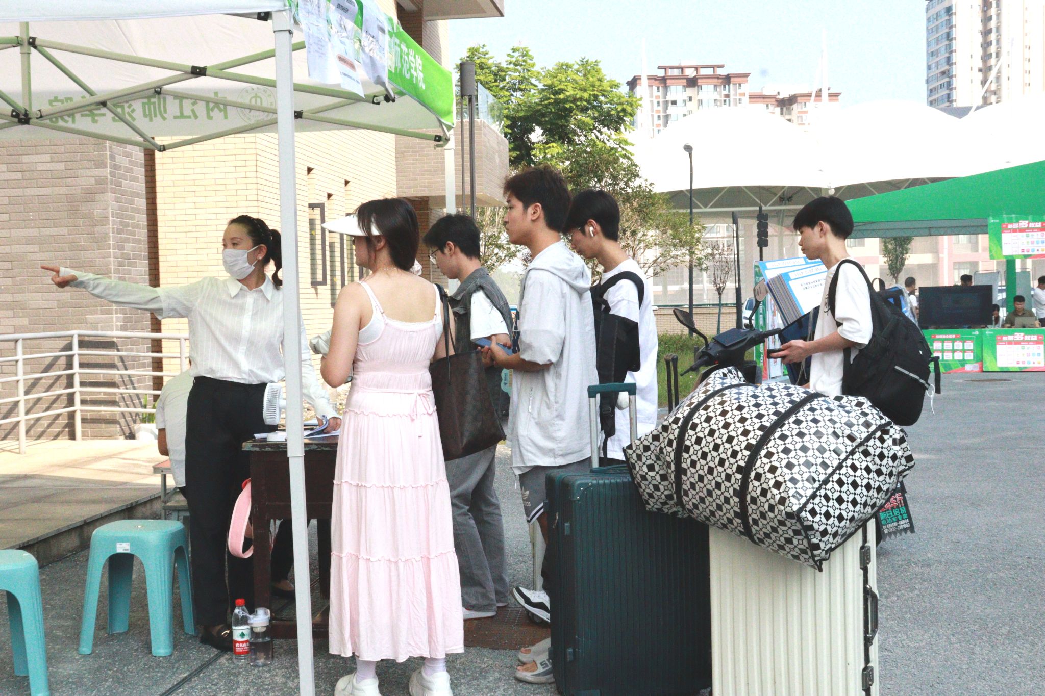 迎新期间,员工党员志愿服务队、迎新志愿者们于弘文楼下高举公司指示牌,提供道路指引服务,以便新生快速抵达目的地,避免造成交通拥挤,大幅提高报到效率。此外,志愿者们还协助新生运送行李,带领他们领取寝室钥匙、卧具、校服以及军训服,介绍校园环境和答疑解惑。公司辅导员、各班班主任及班助们守候在班级报到处,为新生验核身份、登记信息、发放校园一卡通。同时,公司领导亲临迎新现场,深入了解入学报到的具体情况,关心员工家庭情况,激励员工把握时间认真学习,并与新生家长进行了亲切友好的交谈,详细耐心地解答家长们提出的问题。
