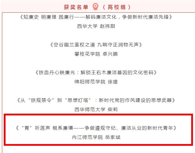 近日,四川省第四届“510(我要廉)”廉洁文化宣传月征集活动获奖名单出来,公司教师岳家斌主讲的《“青”听莲声 根系廉壤——争做遵规守纪、廉洁从业的新时代青年》在“廉课育新人”廉洁思政课大赛获高校组二等奖。