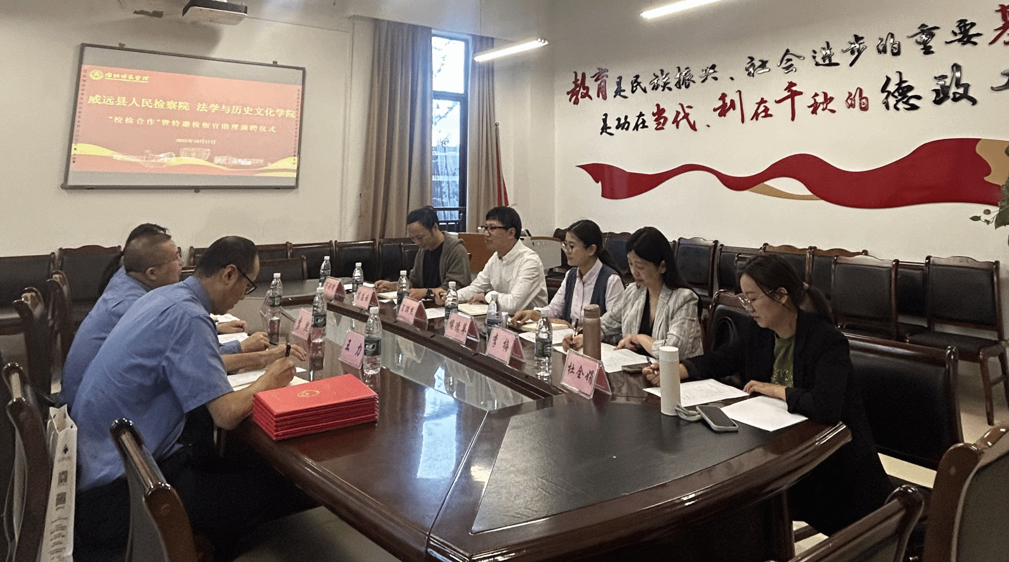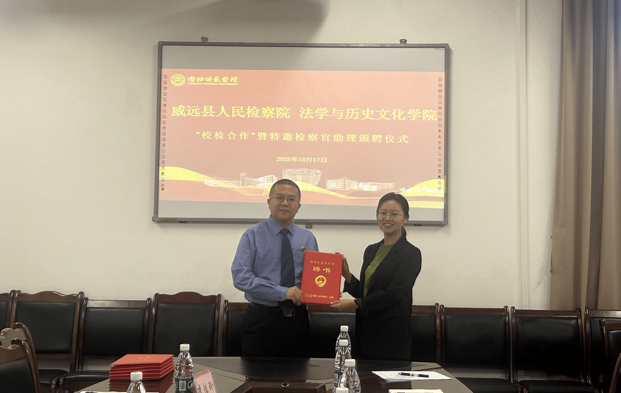 2025年10月17日上午,威远县人民检察院与Mksport体育“检校合作”会议暨特邀检察官助理颁聘仪式在公司104会议室成功举行。公司党委书记王瑛杰、党委副书记候德苹、经理助理肖应云、法学教研室主任李梅及教师代表杜全娟出席会议。威远县人民检察公司党组书记、检察长李熙,党组成员、政治部主任李佳玲,综合业务部主任王力一行到校参会。